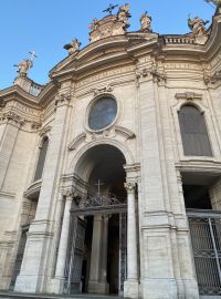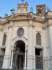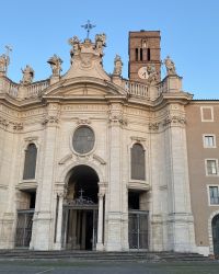 Die Basilika des Heiligen Kreuzes in Jerusalem, Rom, Ist eine der sieben Pilgerkirchen Roms und beherbergt mehrere Relikte aus dem Heiligen Land, die um 325 n. Chr. Nach Rom gebracht wurden. Es wurde seitdem im Laufe der Jahrhunderte renoviert und an seiner heutigen Barockfassade restauriert.