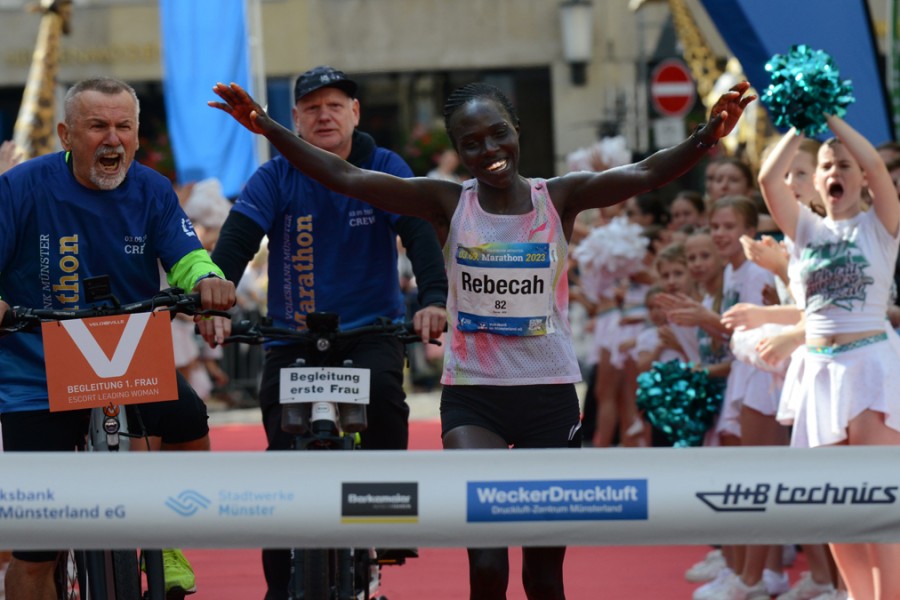 Martin Cheruiyot, Cornelius Kibiwott Chepkock und Justus Kiprotich, das kenianische Quartett, folgte ihm in harmonischem Gleichklang. Nachdem Pfeiffer seinen Dienst nach der Hälfte der Strecke (64:25 Minuten) beendete, waren die Läufer auf sich allein gestellt, während die Temperaturen um die 20 Grad lagen und Windstille herrschte. Charles Muneria, ein wahrhaft unerschrockener Athlet, konnte bereits den Höhepunkt seiner Karriere förmlich riechen. Von den Zuschauern am Straßenrand angefeuert, die sich immer zahlreicher versammelten, je näher das Ziel in Münster-City rückte, hielt er seinen beeindruckenden Laufrhythmus aufrecht. Schließlich erreichte er den Zielbereich auf dem Prinzipalmarkt, wo alljährlich der rote Teppich ausgerollt wird, und finishte inmitten des jubelnden Publikums in beeindruckenden 2:09:06 Stunden.